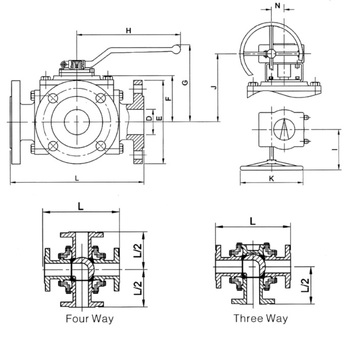 四面座三通四通球閥具有結(jié)構(gòu)緊湊,密封性能號的特點(diǎn),有"T"、"L"和"X"型,可實現(xiàn)對介質(zhì)流向進(jìn)行切換兩種工況。"L"和"T"型可實現(xiàn)對介質(zhì)的分流或混流,各種工況可配備的驅(qū)動方式有手動,氣功,彈簧復(fù)位,電動等。
