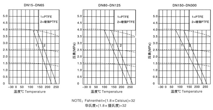 下表中實線所示的密封座額定值,是以閥門處于全閉位置時的壓差為基準,虛線表示碳鋼閥體的最大工作壓力,其他材質的最大工作壓力見下表,虛線與實線的組合表示在給定壓差和溫度工況下最大的閥門額定值,采用聚四氟乙烯和增強聚四氟乙烯密封座的閥門在閥體材料能使用條件下,可用于-73C(-100F)的介質溫度。